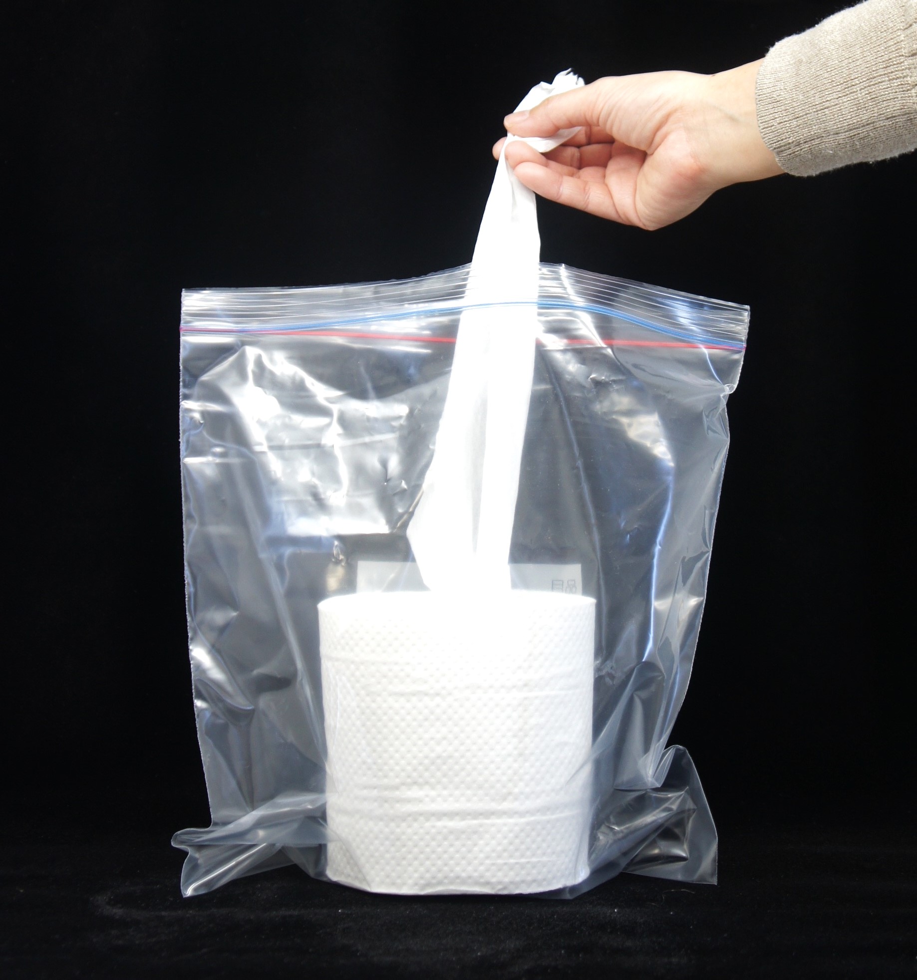 チャック付きポリ袋のファスナーを閉じると、半分程度の体積になります。使うときはチャック付きポリ袋に入れたまま、ロールの中心から紙を引っ張り出します。