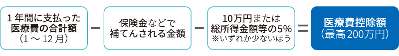 医療費控除とは、自分自身や生計を同じくするご家族のために、1年間に支払った医療費が10万円を超えた場合(または総所得金額が200万円未満の方で、支払った医療費が総所得金額の5%を超えた場合)に、所得税や住民税の控除を受けられる制度です。必要な書類を用意して、ご自身で確定申告をすることで還付金を受け取ることができます。なお、具体的な医療費控除額は、下記の計算式で算出可能です。
