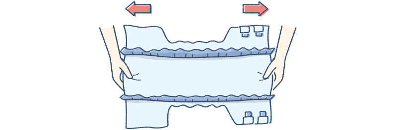 交換用のおむつを用意します。おむつの前後を持ち、矢印の方向に2~3回やさしく伸ばすのがポイント。左右の横モレ防止ギャザーが立ち上がり、より体にフィットさせることができるようになります。