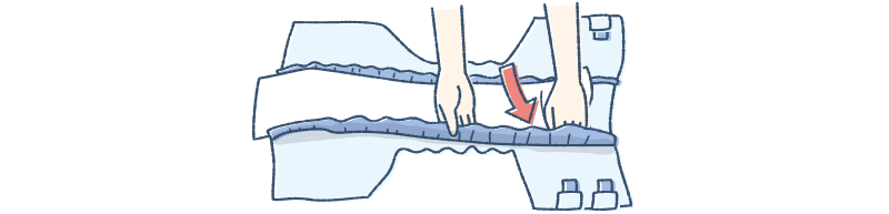 おむつにテープタイプ用の尿とりパッドをセットします。おむつの背中や足まわりのギャザーの上に重ならないよう、内側に収めてください。