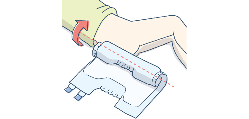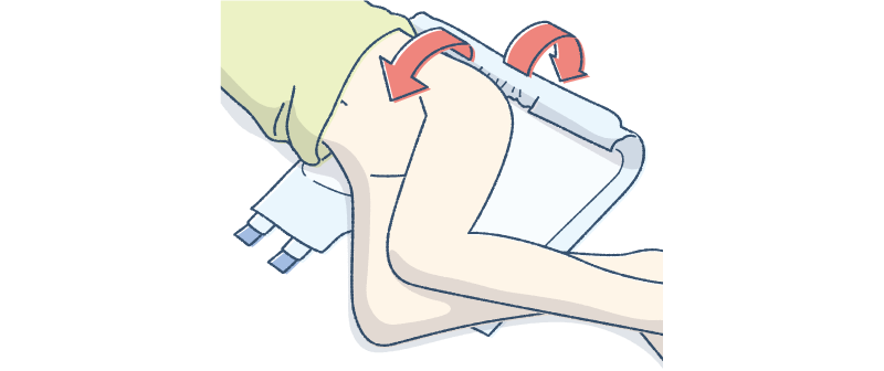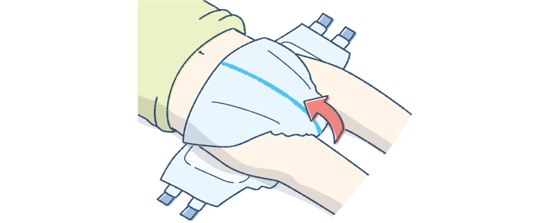 体をおむつの上に戻し、丸めたおむつを反対側から出します。このとき、おむつを引っ張ると肌に負担をかけてしまい、皮膚がはがれるなどの原因となるのでご注意ください。