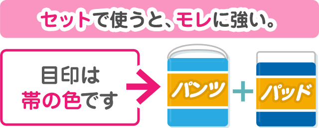 組み合わせて使えるおむつとパッドは、パッケージの帯が同じ色になっていますので、購入時の目印にしてください。