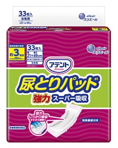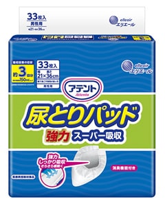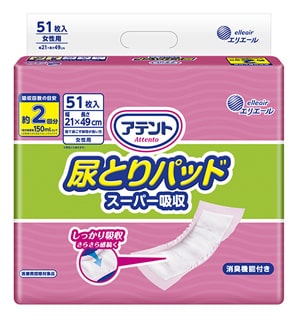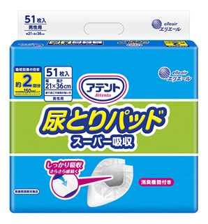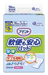 アテントでは、テープタイプの紙おむつの中にあてて使う、三層構造吸収体で便と水分を分離しすばやく吸収する安心の尿とりパッドをご用意しています。
