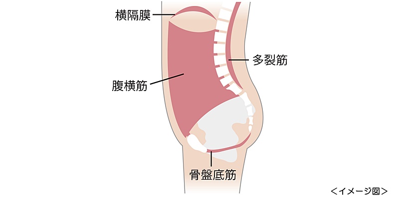 骨盤底筋には、腹圧を一定に調整する役割もあります。腹圧とは、おなかの中の空間を保つ圧力のこと。骨盤底筋は、肺呼吸に関わる横隔膜、おなかの腹横筋、背中の多裂筋とともに腹圧を調整しており、体幹を構成するインナーマッスルとも呼ばれます。