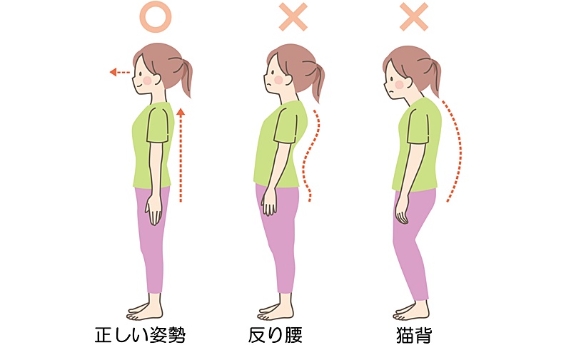 骨盤底筋のゆるみは、姿勢にも影響を与えます。骨盤底筋がゆるむと腹圧が低くなり、脊柱や骨盤が不安定になります。その結果、骨盤が前傾して反り腰になったり、体の重心のバランスをとろうと猫背になったりしてしまうのです。