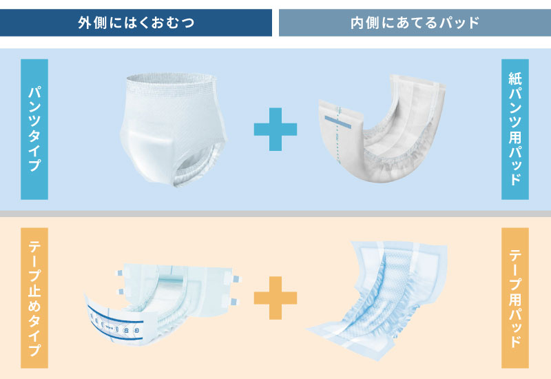 内側にあてるパッドは、外側にはくおむつの内側にあてて使用する吸水パッドです。パンツタイプのおむつにぴったり収まる「紙パンツ用パッド」と、テープ止めタイプのおむつに適した「テープ用パッド」があります。