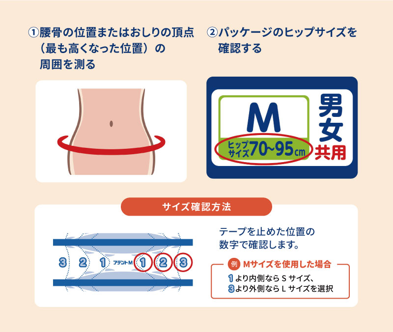 テープ止めタイプの「アテント 背モレ・横モレも防ぐ うす型スーパーフィットテープ式」、「アテント 消臭効果付きテープ式 背モレ・横モレも防ぐ」では、テープを止めた位置で最適なサイズを確認できます。テープを止めた位置に書かれた数字をチェックして、「2」なら現在のサイズがベスト、「1」より内側なら1つ下のサイズ、「3」より外側なら1つ上のサイズが適正サイズです。