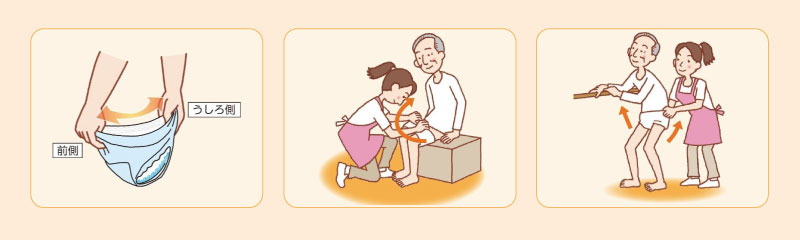 外側にはくおむつは、単独でも使用できます。介助があれば立てる・座れる場合は「パンツタイプ」、寝て過ごすことが多い場合や主におむつ内で排泄する方には、「テープ止めタイプ」が向いています。