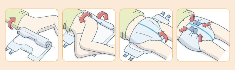6. 体をゆっくりと仰向けにしておむつの上に来るようにし、丸めていたおむつを反対側から出します(おむつを引っ張ると皮膚を傷つけるおそれがあるので注意)。