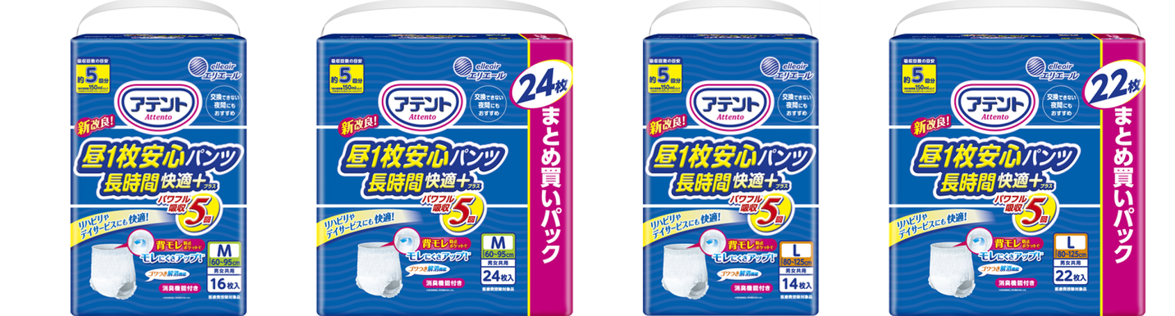 1980年に誕生した「アテント」シリーズは、「もっといいパンツになる。」を合言葉に、体にも心にも寄り添える大人のパンツとして進化を続ける大人用紙おむつブランドです。アテントは、介助する方にとっても介助を受ける方にとっても頼れる紙パンツを目指して、さまざまな商品をラインナップしています。