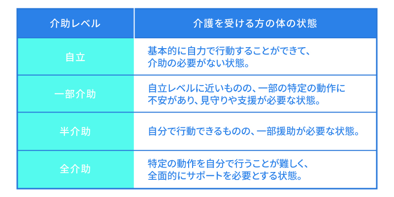 介助を行う際には、介助を受ける方の介助レベルを理解しておくことが必要です。介助レベルは、身体状況によって4段階に分けられます。介助レベルを把握することで、自分でできることまで手を貸してしまう「過介助」を防ぐことができるでしょう。