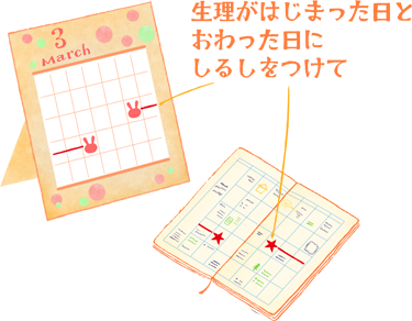 手帳やカレンダーの、生理が始まった日と終わった日に印をつけて、月経カレンダーを作りましょう。自分の生理周期を知ることができますし、旅行やお出かけの予定が立てやすくなります。