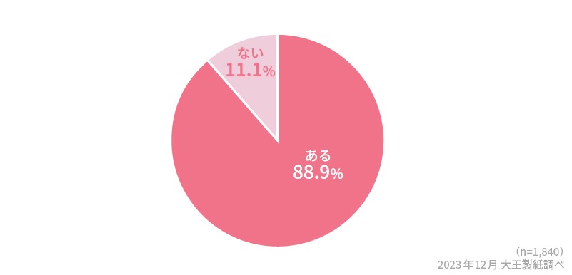 旅行と生理が重なった経験が「ある」と答えたのは88.9%、「ない」が11.1%という結果になりました。この結果から、全体の9割近く、アンケートに答えたほとんどの女性が旅行期間と生理が重なった経験があることがわかります。