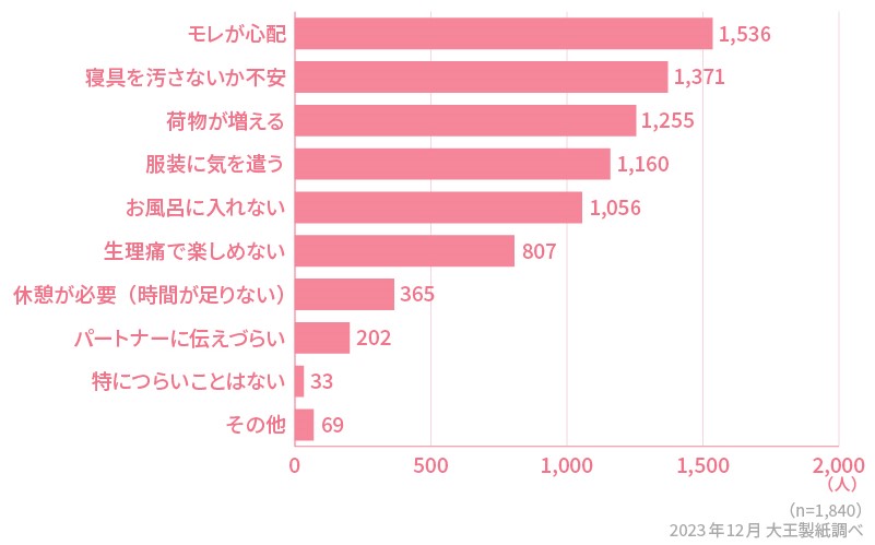 続いて、「お風呂に入れない」「生理痛で楽しめない」などの回答が上がり、中には「パートナーに伝えづらい」という回答もありました。