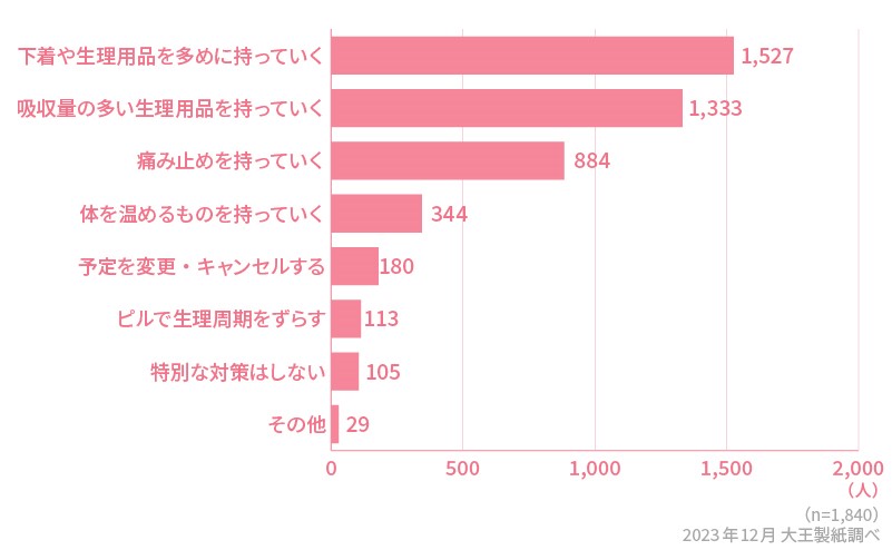 旅行と生理が重なりそうなときの対策として多かったのは、「下着や生理用品を多めに持っていく」「吸収量の多い生理用品を持っていく」という回答でした。生理用品をこまめに交換したり、普段より吸収量の多いものを使用したりすることで、モレ対策を行っている人が多いようです。