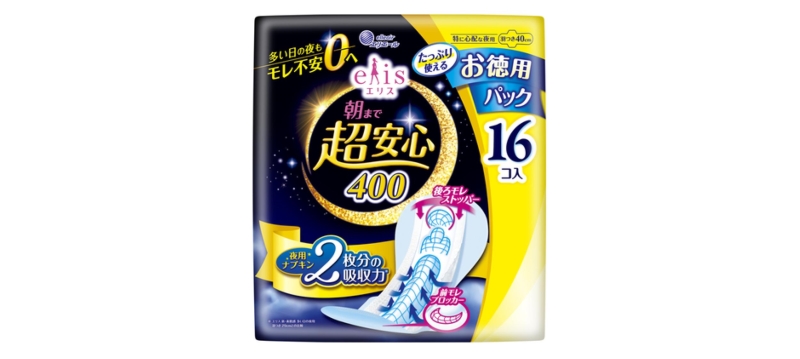 寝ているあいだのモレが心配なら、たっぷり吸収の「エリス 朝まで超安心」シリーズがおすすめです。特に「エリス 朝まで超安心 400(特に心配な夜用)羽つき 40cm」は、夜用ナプキン2枚分※の吸収力があるだけでなく、後ろモレはもちろん、前モレ&横モレもガード。多い日でも朝まで気にせずに寝ることができます。経血をぐっと引き込む表面シートだから、肌ざわりもさらさらをキープします。