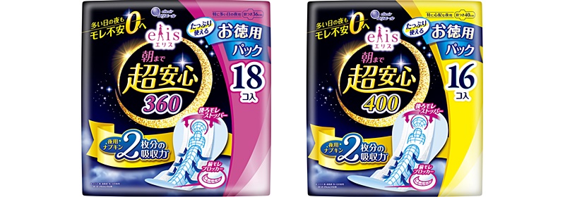 「今日は多い日だから、寝ているあいだのモレが不安」というときには、モレを防ぐ形とたっぷりの吸収力を備えたナプキンがぴったり。スリット入りの<すきまフィット吸収体>と<三日月ブロッカー><横モレガードギャザー><後ろモレストッパー>で、前モレ&横モレ&後ろモレを防ぐ「エリス 朝まで超安心」シリーズがおすすめです。