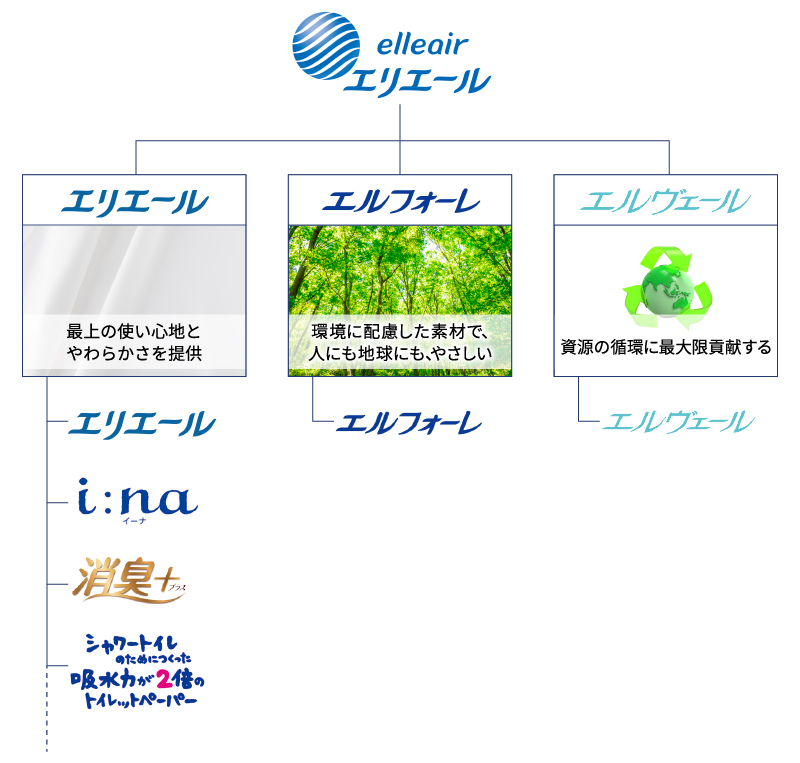 大王製紙のホームケア・パーソナルケア商品には、「エリエール」というブランド名をつけています。ですが、トイレットティシューに関しては、さらに3つに分類しています。最上の使い心地とやわらかさを提供する「エリエール」、環境に配慮した素材を使用した、人にも地球にもやさしい「エルフォーレ」、そして、リサイクルペーパーだけを使用し、資源の循環に最大限貢献する「エルヴェール」です。