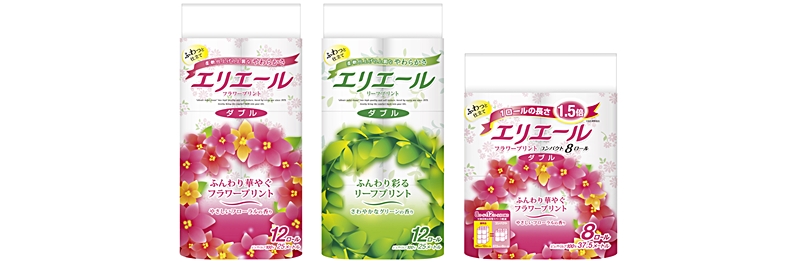 「エリエール トイレットティシュー」のやわらかさはそのままに、プリント柄をプラスしたのが「エリエール フラワープリント」と「エリエール リーフプリント」です。
