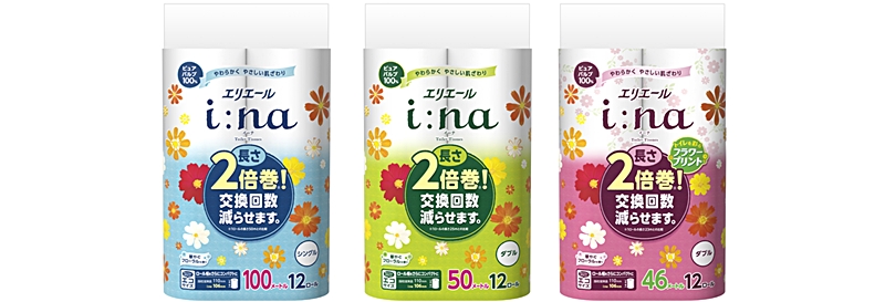 柔軟剤仕上げのやわらかな肌触りで、長さ2倍巻を実現したのが「エリエール i:na(イーナ)トイレットティシュー 2倍巻」です。長巻タイプでも1ロールの巻きの固さを均一にする独自技術を活用し、やわらかさとなめらかさを実現。ピュアパルプ100%で、華やかなフローラルの香りも特長です。また、ロール幅を110mm(通常品114mm)に小さくすることで、芯や包装フィルムを削減した、環境にもやさしい商品となっています。