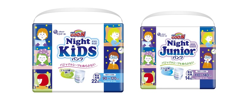 夜中のおしっこでお悩みのママ・パパにおすすめなのが、「グーン ナイトキッズパンツ」と「グーン ナイトジュニアパンツ」です。うつぶせ寝のときのモレに対応するため、パンツの前側に素早く吸収・拡散する「前側スピード吸収シート」を採用。通常の紙おむつの3倍の厚みを持つシートが、前側からのモレをブロックします。