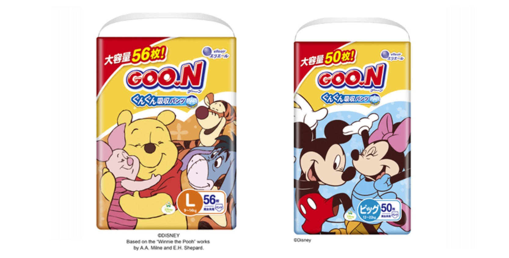 パッケージとおむつ柄には、「くまのプーさん」をM・Lサイズに、世界中から愛される「ミッキー&フレンズ」を BIG・BIG より大きいサイズに採用。 各サイズ6~8種、合計28種のおむつ柄デザインで、笑顔あふれる豊かな表情のキャラクターが描かれています。サイズごと に異なるデザインで、おむつ替えの時間を楽しく彩ります。