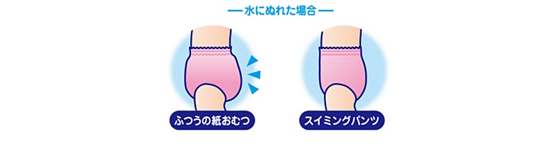 紙おむつタイプのベビー水遊び用パンツには、通常の紙おむつよりスリムな吸収体が使われているため、おしっこやゆるゆるうんちはモレてしまう可能性があります。余ってしまったからといって、通常の紙おむつの代わりに使うことはできないので注意が必要です。