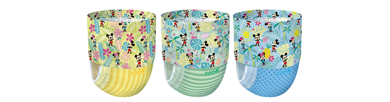 「グーン スイミングパンツ」は、1パックにイエロー、グリーン、ブルーの3種類のデザインが入ったアソートパック。男の子も女の子も楽しくなるアロハデザインで、気分に合わせて好きな柄を選ぶことができます。