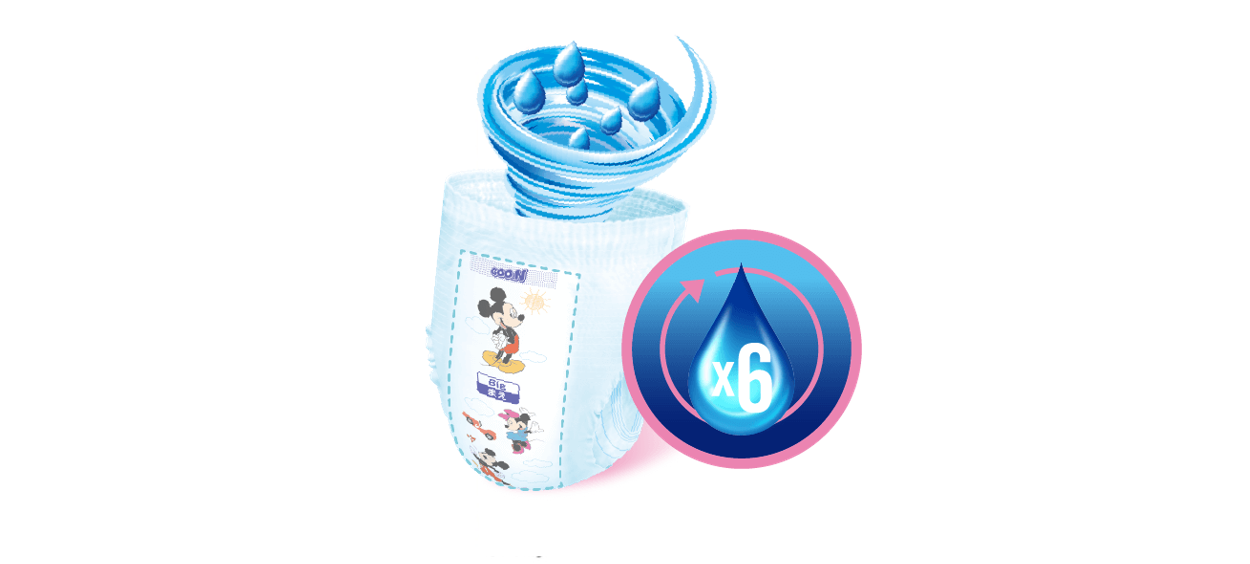 「グーン12時間ぐんぐん吸収パンツ」はおしっこをたっぷり6回分※1も吸収するので、昼でも夜でも、長時間繰り返しおしっこをしてもモレずに安心です。