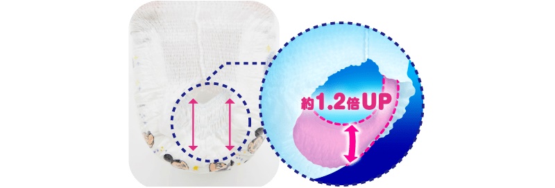 「グーン12時間ぐんぐん吸収パンツ」は、通常商品※2に比べてギャザーの高さを約1.2倍にアップ。足まわりをしっかりと包み込んで、寝ているあいだに激しく動いたり寝返りをうったりしても、隙間ができにくくなっています。