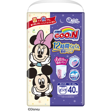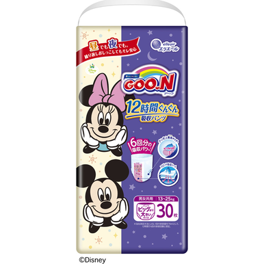 「グーン12時間ぐんぐん吸収パンツ」は、おしっこをたっぷり6回分吸収。昼でも夜でも、長時間繰り返しおしっこをしてもモレずに安心です。また、寝ているあいだに激しく動いても、隙間ができにくいグーン史上最高(さいたか)ギャザー、おしっこを素早く吸収して拡散する「スピード吸収シート」、楽しくおむつ替えができるディズニーデザインを採用しているのもポイント。おむつからのモレに悩むママ・パパにおすすめです。