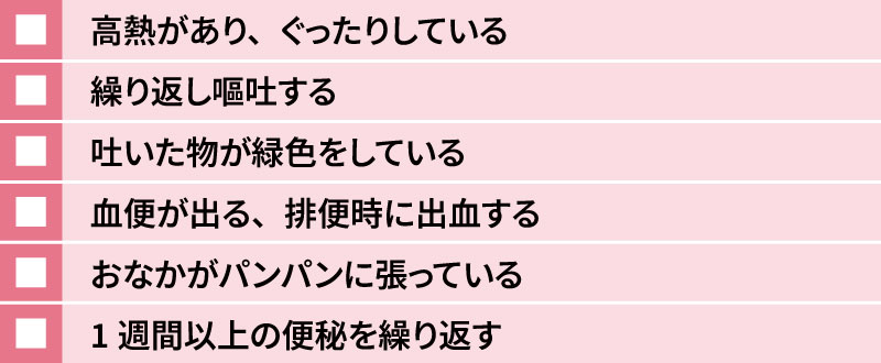 そのほか、便が出にくくなっている原因が、肛門の病気というケースもあります。便が出ないだけでなく、「食べられない」「飲めない」「ぐったりしている」「元気がない」「いつもと様子が違う」といった状態が見られたら、すぐに病院を受診してください。