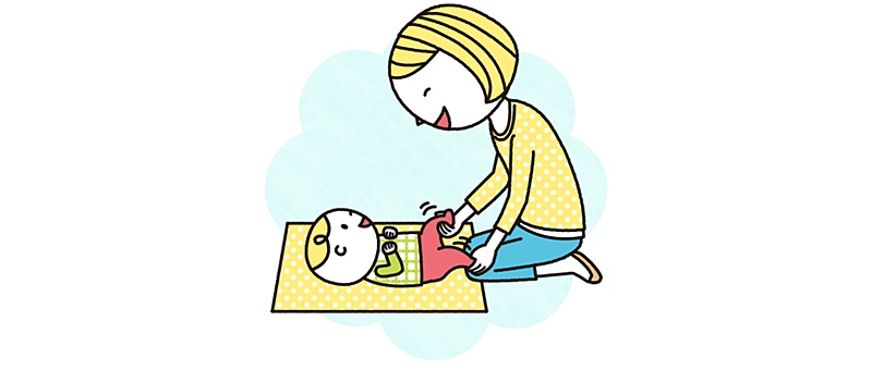 おへその下あたりに手をあて、「の」の字を描くように、手のひらでおなかをやさしくさすってあげましょう。腸を刺激することで、うんちが出やすくなります。
