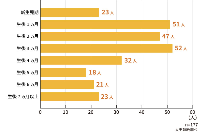続いて、Q1で病院を受診したと回答した先輩ママ・パパに、乳児湿疹で受診した際の赤ちゃんの月齢を伺いました。その結果、生後3ヵ月が52人、生後1ヵ月が51人、生後2ヵ月が47人と、生後1~3ヵ月の時期に回答が集中。この時期の赤ちゃんは、肌トラブルが多い傾向であることがわかりました。