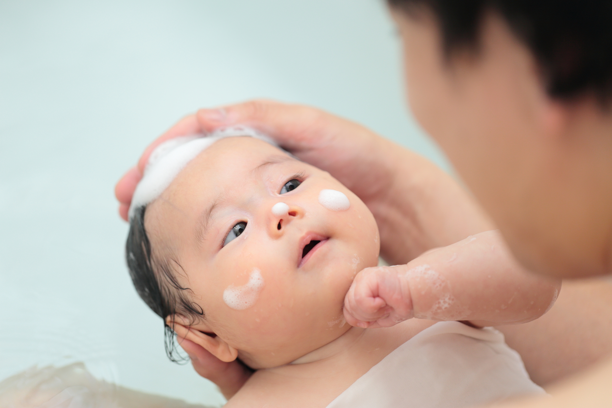 流すときは、泡をきちんと落とすように心掛け、頭や顔に湿疹がある場合は、頭皮や眉毛、耳周りにすすぎ残しがないように注意してください。お風呂から上がったら、すぐにベビー用の保湿剤を塗り、乾燥を防ぎます。
