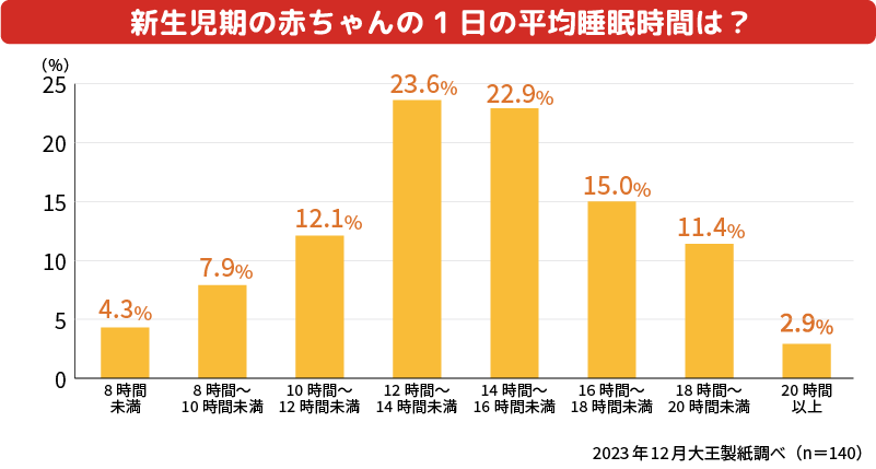 新生児の1日の平均睡眠時間は、「12~14時間」が23.6%、「14~16時間」が22.9%とほぼ同率。ちなみに、1回あたりの平均睡眠時間は「2~3時間」という回答が半数以上で、2~3時間おきに、寝たり起きたりを繰り返す赤ちゃんが多いようです。
