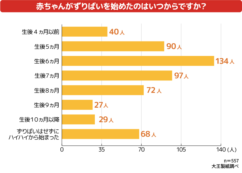 クラブエリエール会員の先輩ママ・パパに、赤ちゃんがずりばいを始めた時期を聞いたところ、最も多かったのは「生後6ヵ月」という結果になりました。生後8ヵ月には、約8割の赤ちゃんがずりばいを始めているようです。