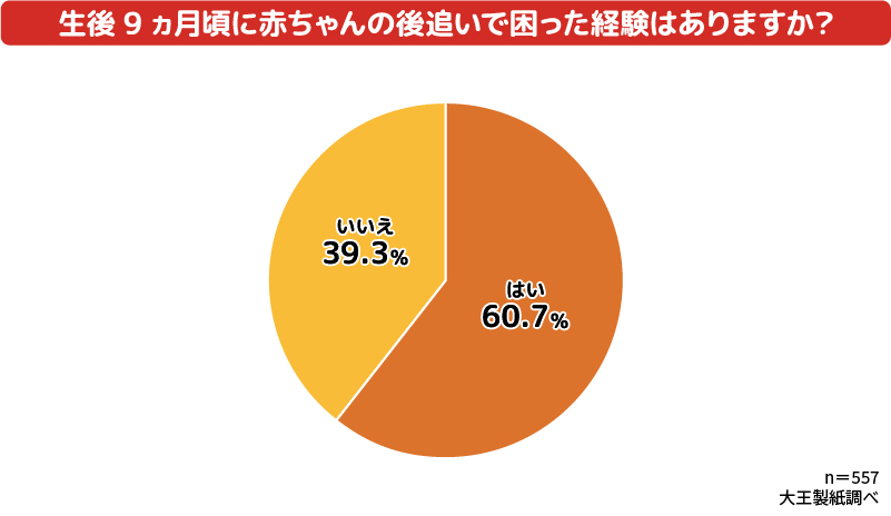 クラブエリエール会員のママ・パパの中で、赤ちゃんが生後9ヵ月頃に後追いがひどく、困った経験がある人は、全体の60.7%という結果になりました。半数以上のママ・パパが、赤ちゃんの後追いに悩んでいたようです。また、赤ちゃんの後追いの対処法を聞いたところ、下記のような回答がありました。