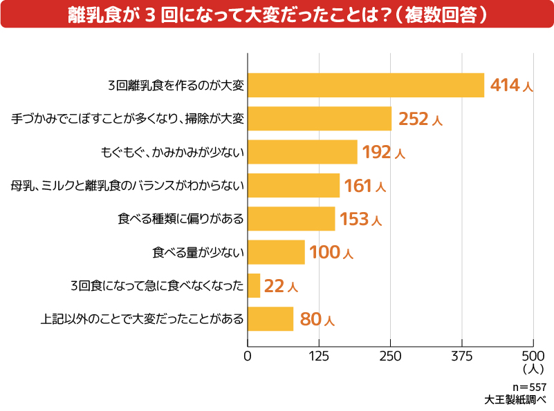 離乳食が1日3回になったことで、クラブエリエール会員の先輩ママ・パパの半数以上が、「3回離乳食を作るのが大変」と「手づかみでこぼすことが多くなり、掃除が大変」という点に悩んだという結果になりました。「もぐもぐ、かみかみが少ない」「母乳、ミルクと離乳食のバランスがわからない」「食べる種類に偏りがある」といったことに悩んだママ・パパも多かったようです。