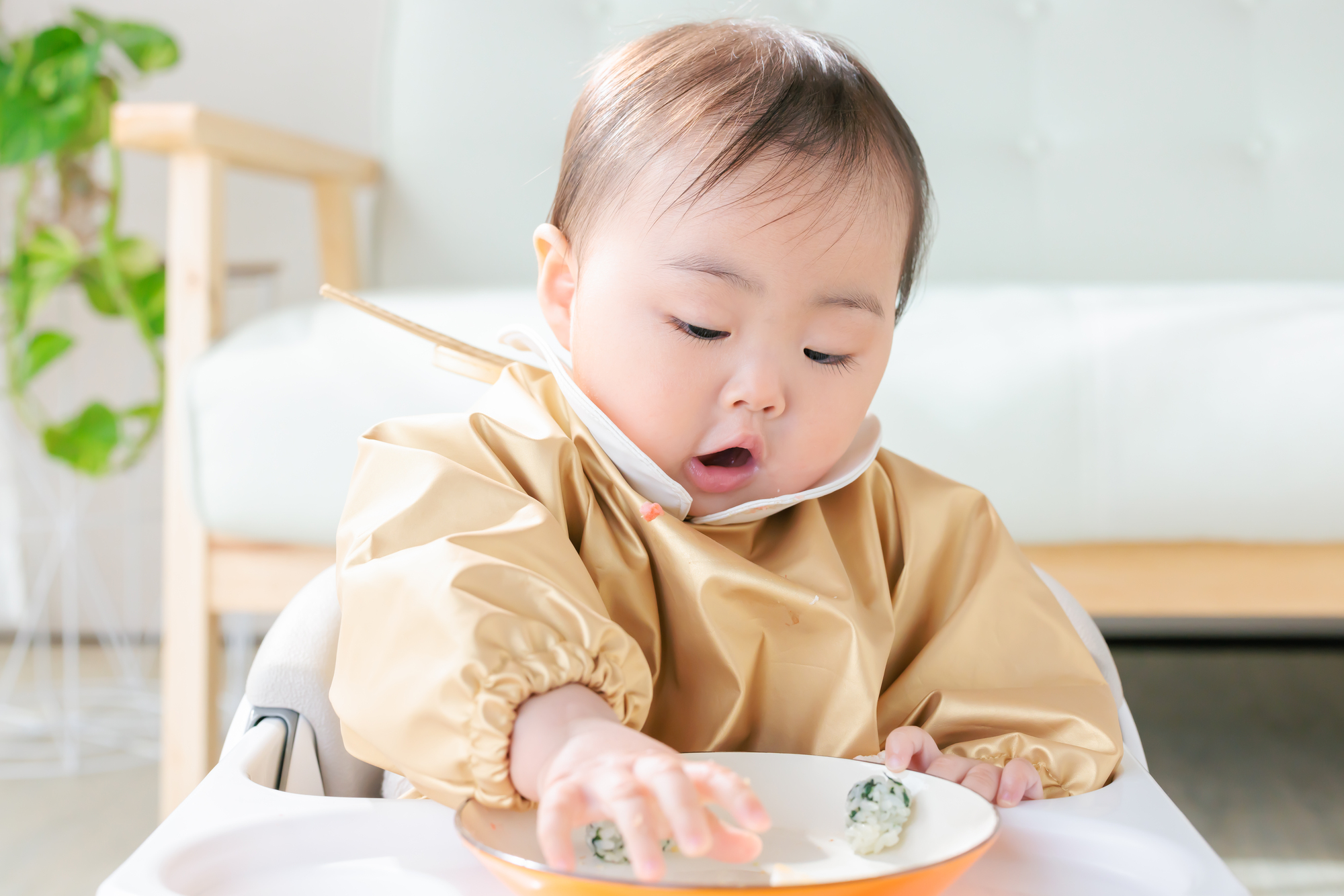 生後10ヵ月は食べ物に興味を示し、みずから手で食べようとする意志が出てくる時期。食べ物で遊んでいるように見えるかもしれませんが、「自分で食べたい!」という自我が芽生えている証です。赤ちゃんの意欲を尊重し、ある程度の食べこぼしは覚悟して、手づかみ食べにトライさせてあげましょう。