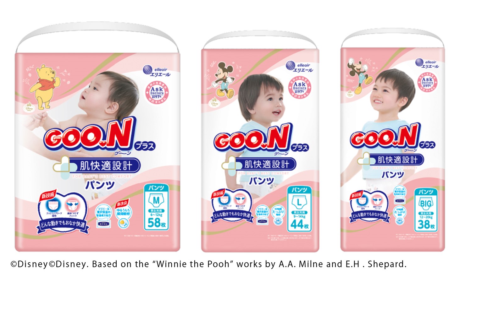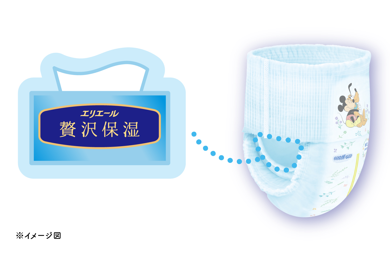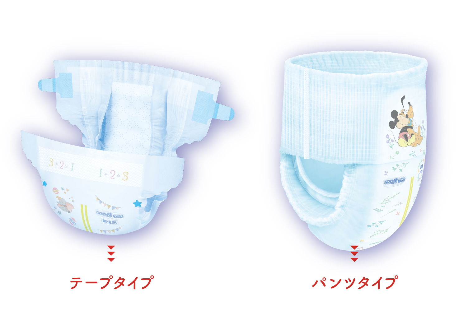 他にも、「グーンプラス 肌快適設計パンツ」には、ムレやモレを防ぐ工夫が満載。各サイズで異なるキャラクターを採用したディズニーデザインも魅力のひとつで、成長を実感しながら楽しくおむつ替えができます。