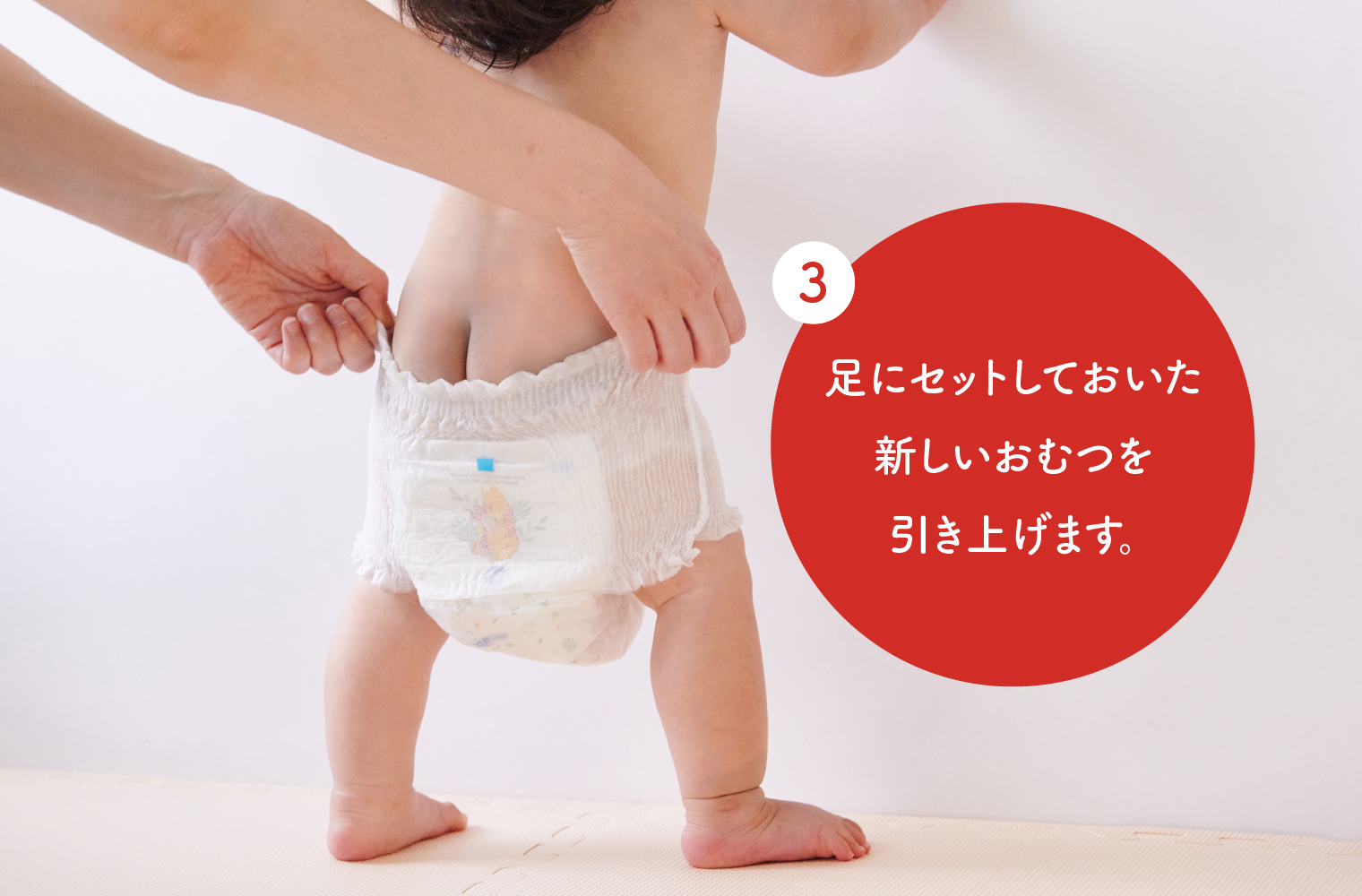 サイドの継ぎ目をビリっと破って取り外すことが、テープタイプとの替え方の大きな違いです。交換するおむつを取り外し、おしり拭きで拭いて、それから新しいおむつに足を通してはかせる、というのがもちろん一般的ですが、こんな替え方・はかせ方もあるので覚えてください。ポイントは、ズボンを脱がせたとき、はいているおむつを取る前に新しいおむつに足を通しておくこと。その状態にしておけば、交換するおむつを取ってきれいにした後に新しいおむつを引き上げるだけなので、スムーズにはかせられます。つかまり立ちができるお子さまでも同様なので、覚えておくと便利ですよ。