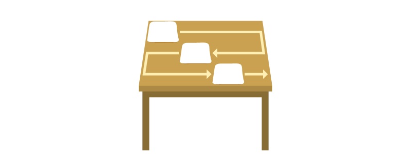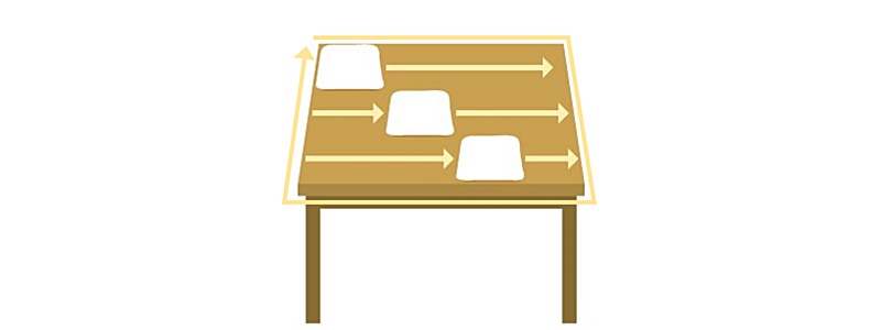 コの字拭きは、片側から反対側まで一直線に拭いたら、手を離すことなく下に動かし、再び反対側へと動かす方法です。一筆書きを描くようにテーブルを拭き上げます。