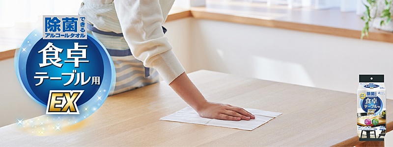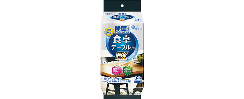 毎日の生活の中で、さまざまな役割を果たすテーブルには、汚れや雑菌がいっぱい。テーブルのキレイを保つには、正しい拭き方で汚れを落として、きちんと除菌をする必要があります。「エリエール 除菌できるアルコールタオル 食卓テーブル用 EX」は、除菌・抗菌・防臭の機能を備えた、食卓テーブル除菌用のアルコールタオル。食卓を気持ちよく、より安心して使うために、ぜひご活用ください!