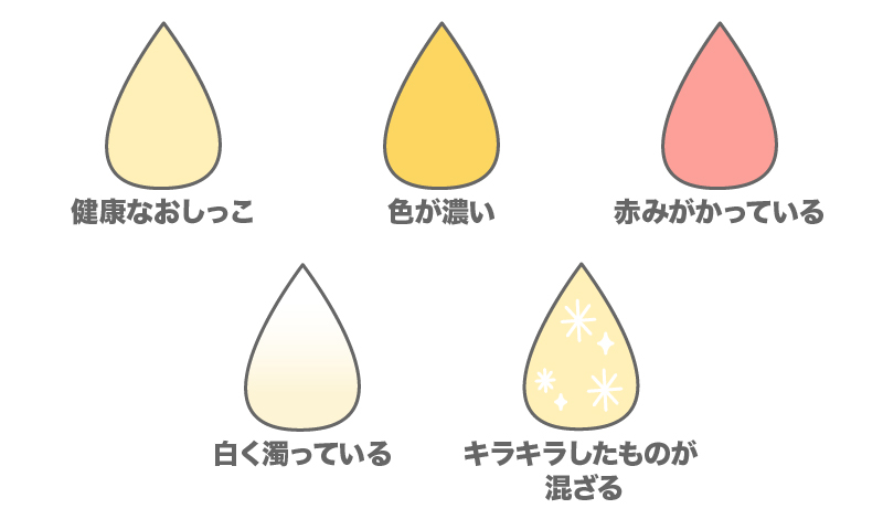 一方で、「色の濃いおしっこがずっと続く」「赤みがかっている」「白く濁っている」「キラキラとしたものが混ざっている」「色がほとんどない(水のように薄い)」といった場合は、病気の可能性があるので要注意です。