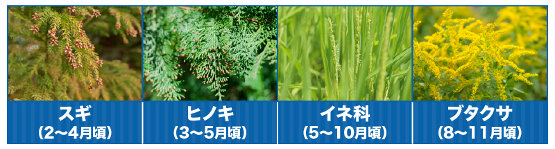 アレルギー症状を引き起こす主な花粉が飛散する時期は地域によって異なりますが、スギが2~4月頃、ヒノキが3~5月頃、イネ科の植物が5~10月頃、ブタクサが8~11月頃です。