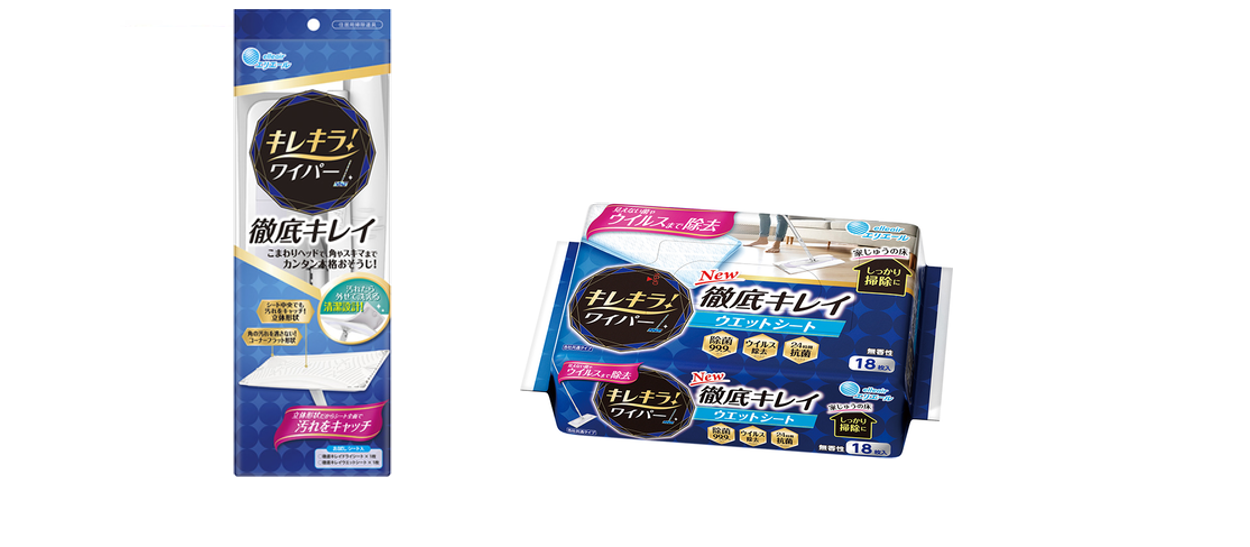 大王製紙の「キレキラ!」シリーズは、お部屋からキッチン・トイレまで、家中簡単に本格的なお掃除ができるアイテムが充実しています。面倒な床の拭き掃除も、フロアワイパー+ウエットシートを使えば簡単キレイ。気になる花粉から細菌やウイルスまで、しっかり除去できます。