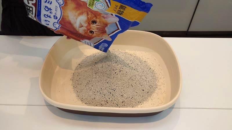 初めに、トイレ容器に「キミおもい カチッと固まるネコ砂」を敷き、スコップで表面をならします。砂を敷く際に細かい粉が若干舞いましたが、気になるほどではありませんでした。
