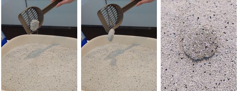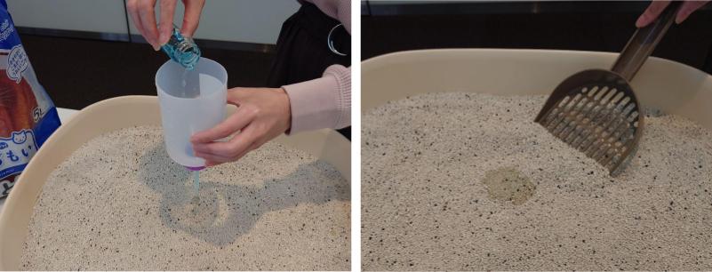 実験では、ネコちゃんのおしっこの代わりに、青色に着色した生理食塩水を使用。ネコちゃんの1回分のおしっこの目安量として20mlを注ぎ入れ、ネコちゃんが排尿後に砂をかける状況を再現するために上から砂をかけました。