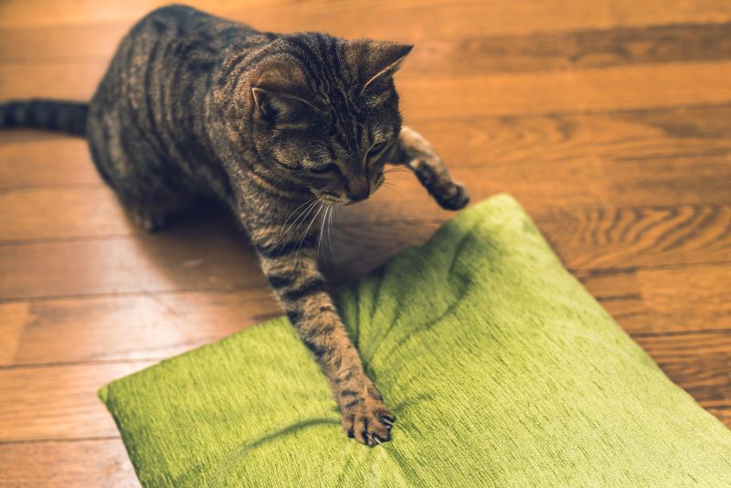 ネコちゃんがおもちゃで遊んでいるときなどに、床を踏みしめるように前足でふみふみすることもありますが、これはネコちゃんの「やるぞ!」という意欲の表れ。狩りをするときなどによく見られる行動で、運動前のウォーミングアップのようなものだと考えられています。